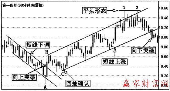 上圖為第一醫藥(600833)的一段60分鐘K線走勢圖,這一段行情處于該股的一段中期上漲趨勢中。圖中標示“短線下調”的位置,是上漲過程中的短線回調,股價在回調過程中運行在一個下降通道中。在A點,股價快速向下突破支撐線,探底后收出一根探底反彈的錘子線,接著股價馬上向上突破下降趨勢線(阻力線),出現短期高點B。股價回抽后在C點形成新的低點,之后開始新的上漲趨勢。