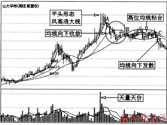圖是山大華特(000915)的一段周K線走勢圖。市場經(jīng)歷一段長期上漲后,K線出現(xiàn)了由幾根帶長上影線的K線組成的頂部風高浪大線.同時上影線的高點也幾乎一樣,這樣就構(gòu)成了K線中的平頭形態(tài)。股價處于高位時.成交量也出現(xiàn)天量。從K線形態(tài)和成交量來看,市場見頂意味濃厚。此后在A點位置,MA5向下轉(zhuǎn)向,向MA15和MA30靠攏,均線開始向下收斂,說明市場進人調(diào)整格局。短期均線向下轉(zhuǎn)向后,謹慎的投資者可以逐步減倉。B點位置之后,三條均線相互交織,股價在高位區(qū)域形成了均線的高位黏合,投資者可以觀望等待市場選擇方向。在C點后,短期均線首先向下轉(zhuǎn)向,并且向下的角度加大,開始遠離MA15和MA30,均線向下發(fā)散,此時K線也連續(xù)出現(xiàn)兩根中陰線.說明市場高位均線黏合后選擇了向下的方向。此時,中長線投資者唯一的任務就是賣出手中的股票。