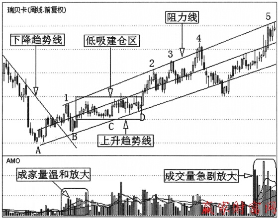 如圖是瑞貝卡(600439)的一段周K線走勢圖。從圖中可以看出,長期上漲趨勢形成前的一段時間,該股處于下跌趨勢中。趨勢反轉之前,股價快速大幅殺跌,在低點A開始企穩反彈。隨后股價向上突破了前期下降趨勢的下降趨勢線,反彈過程中成交量有所放大.并出現了一個反彈高點1。反彈結束后,股價又開始下跌,但是股價在高于A點的B點受到支撐,之后再次反彈,股價重新回到上次反彈高點I的位置,這表明股價已經脫離前期下降趨勢線的束縛。