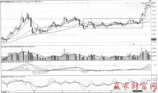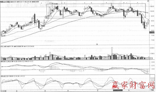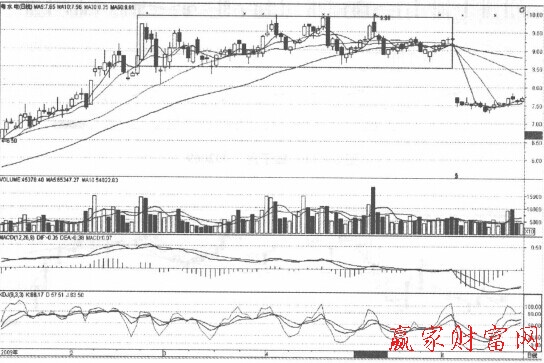 如圖所示,粵水電也是在高位形成一個橫向的平行趨勢,股價到前高附近反轉下行,到一個水平低點則又反轉向上,如此反復了較長時間。短線投資者可在低點買進,高點賣出,做差價。但空間不是很大,股價又在高位,需十分小心。