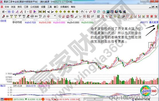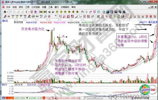 當(dāng)然在實(shí)戰(zhàn)操作過程中,我們要知道,買進(jìn)一只上升通道下軌附近的股票后,它的第一阻力位在近期的高點(diǎn)附近,此阻力位阻力很小,第二阻力位在上升通道的上軌附近,該處會(huì)有一定的阻力,第三阻力位是前期熊市下跌階段的下一個(gè)重要阻力位,即下跌過程中某一平臺(tái)或反彈高點(diǎn),這才是真正的重要的阻力位。當(dāng)周線過了前期熊市的某一重要阻力位后,所形成的波段賣點(diǎn)準(zhǔn)確度會(huì)大大提高,所過的阻力位越高,那么形成的波段賣點(diǎn)就越準(zhǔn)確。如下面的嘉化能源走勢(shì)圖。