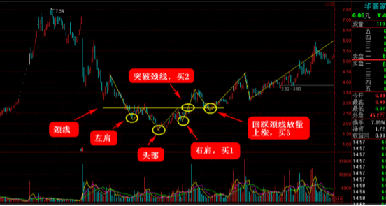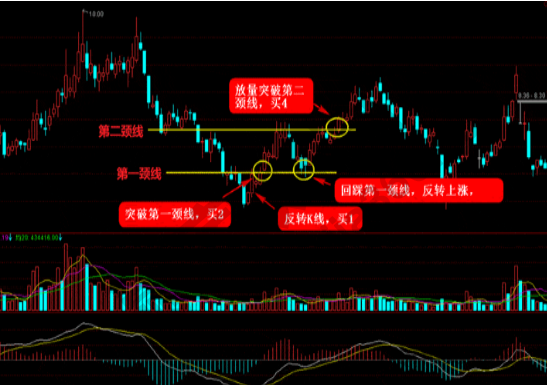 3)突破頸線之后,上漲一波之后回落,回落之后并不會(huì)跌破頸線,之后再次量能配合放量上漲,成為第三個(gè)買點(diǎn);