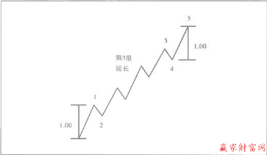第一種,浪3出現延長。當浪3延長時,浪1和浪5等向延長,或成0.618的倍率關系。實際上,無論是等長,1.618還是2.618,所有的驅動浪走勢都和斐波那契數列有著密切聯系。