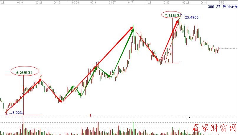 艾略特的觀點認為,波浪大于中級浪時。波浪理論的價格關系通常用百分比來計算;波浪處于中級浪或者中級浪以下時,價格可以用算術來計算,此時的百分比值和算術值計算結果幾乎是相當的。從日趨勢線可以看出,浪1和浪5的上漲幅度其實更為接近,浪3的上漲幅度明顯大于浪1和浪5上漲幅度趨向等長。和諧的比率關系是我們預測市場的基礎。當市場第三浪的上漲幅度超越第一浪的上漲幅度之后,我們就可以預見,未來第五浪的上漲可能會趨同于第一浪。因此,第五浪的上漲幅度接近于第一浪的上漲幅度的時候,就要密切關注市況的發展,及時減持手中的股票頭寸,此時的股市逆轉很有可能發生,設好止損位是市場獲利的保障。300317先河環保的走勢圖剛好符合我們此次的技術分析。