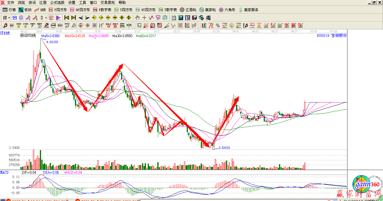 寶鋼股份600019,我們可以看到完美的下跌走勢,在這種權重參與股中參與運作的都是大資金,所以它的走勢符合技術相當完美,我們可以清晰的看到市場中波浪的此消彼長,漲跌有序。
