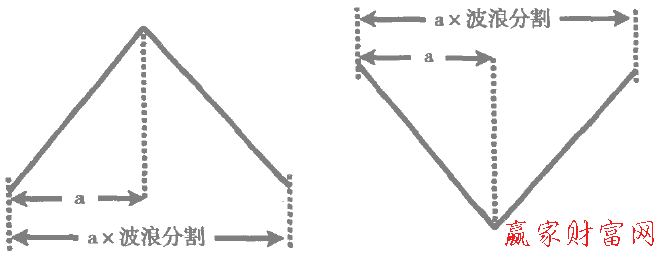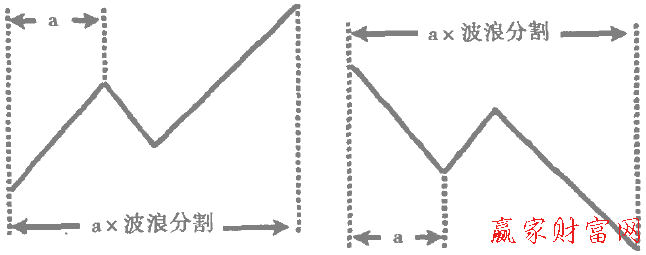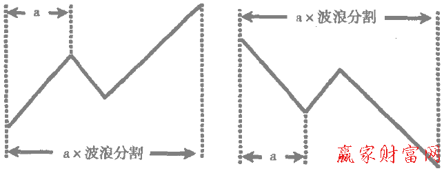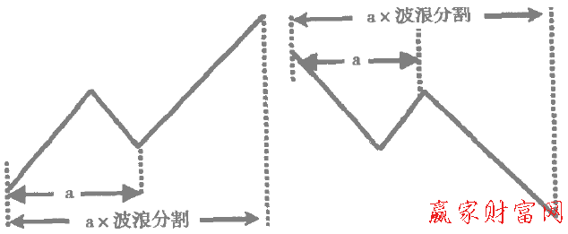 第三,一段趨勢的起點與其后相反趨勢的終點構(gòu)成的循環(huán)所經(jīng)歷的時間乘以波浪分割將會是其后一段趨勢的終點。如下圖所示。