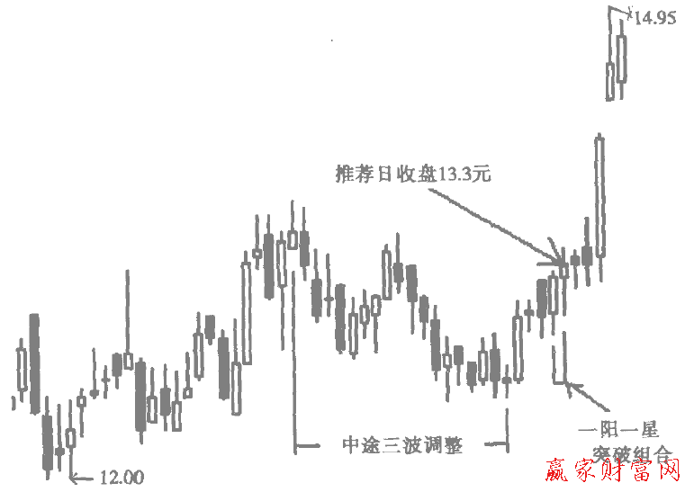 在上升途中出現(xiàn)回調(diào)以單波或3波最強(qiáng),如果以5波出現(xiàn),未來(lái)創(chuàng)新高之后出現(xiàn)的回檔也會(huì)很深,在操作上,3波回調(diào)以突破跟進(jìn)為好。判斷突破有兩點(diǎn)要切記:(1)從第三波底部到面臨突破時(shí)間不能太長(zhǎng)。(2)突破之時(shí)手法應(yīng)干凈利落,最好以一陰一陽(yáng)或一陽(yáng)一星這樣的K線排列來(lái)完成。如下圖所示: