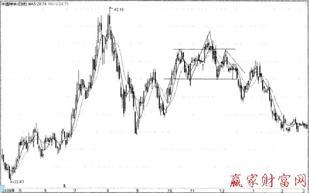 使用波浪理論分析和判斷行情走勢,最重要的就是數浪要正確,如果數浪數錯了,那可能導致行情預測的偏差,通過波浪理論和技術指標的綜合分析,可以提高預測的準確性,波浪中的頂點在實際的行情走勢中不完全都是簡單的形態,有時候是由某些經典形態構成,如技術分析中的著名形態“頭肩頂形態”。則可看作波浪理論中的標準頂點,對于某些不規則的調整浪的頂點,往往也會演變成“頭肩頂”的形態等。下圖所示為“頭肩頂”形態作為(B)浪次一級C浪的頂點。