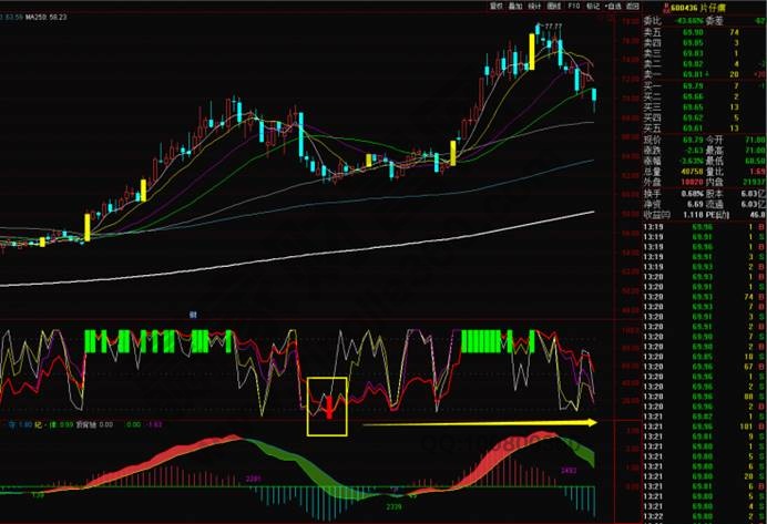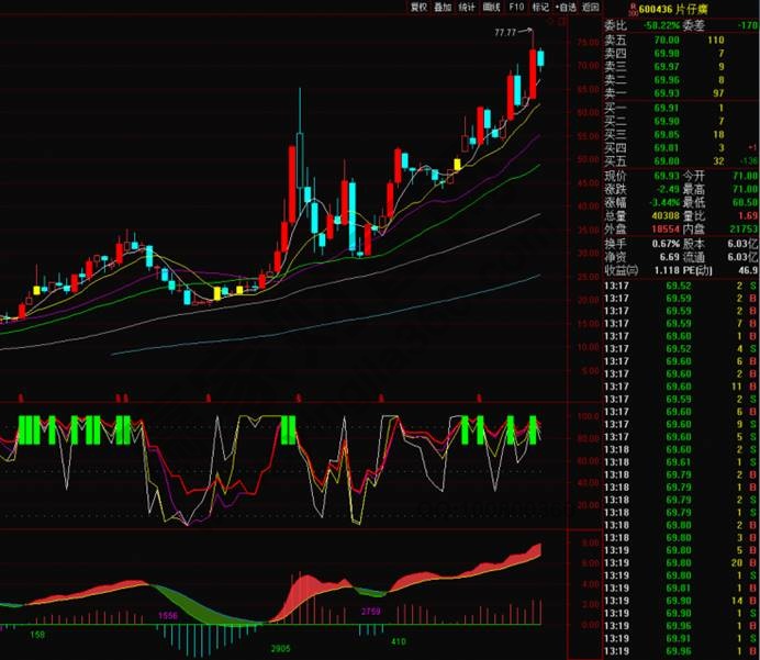 對于投資者抄底來說,首先就是備選股票池的建立,這個方法的條件就是,大家應該選擇月線向上形態的個股。簡單的定義這個走勢的形態包括:月線紅三兵和月線5、10、20周期均線多頭發散。如果月線的上升形態沒有被動打破的話,那么在大盤止跌后可以在抄底備選股中宣召跌到位的個股來進行抄底,此時大家可以通過DKDB指標作為抄底的輔助指標,我們來看片仔癀走勢圖。