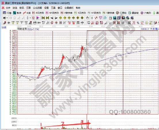 判斷量能承接是提高操作成功率,為輔助性指標(biāo)。通過案例大東海A(000613)我們進行具體的實戰(zhàn)應(yīng)用。如下圖,分時圖中顯示該股略微低開后震蕩回落,早盤10點展開一波帶量反彈,隨后窄幅震蕩,10點44分第二次帶量反彈,休整平臺高于第一波反彈高點,11點18分大單秒拉3%,圖形中看出,拉升力度、空間越來越強,休整時間越來越短有加速之勢,一切事跡成熟后,大單封板。