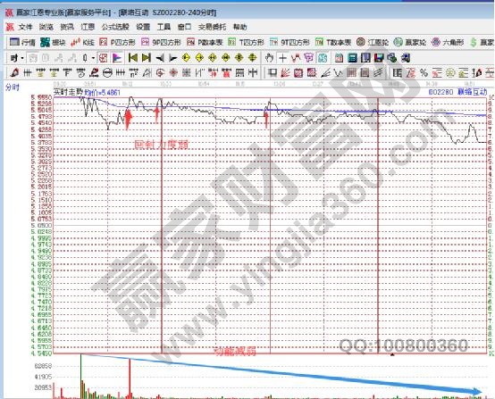 再來一張開板量能回補不足案例。聯(lián)絡(luò)互動002280,開盤漲停,早備用9:45分開板,10點10分鐘有一次回封動作,從量能上看回封強度不足,隨后多次嘗試反攻回封動作,結(jié)合量能承接看,力度越來越弱,動量降低。無新的動能承接,導(dǎo)致價格走低。