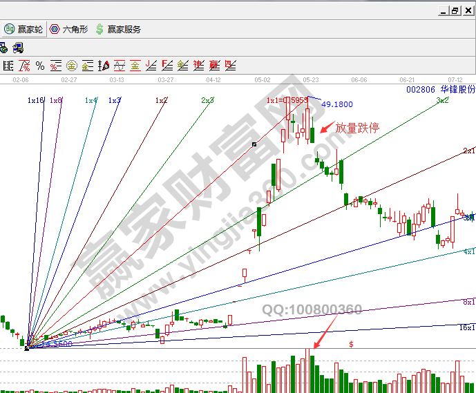 了解過什么是放量跌停之后,對于放量跌停意味著什么相信大家更容易理解了。其實際就是有大量資金想要從某只或某些股票里走出來,而有人接住了放出來的股票,這樣的交易量就會比較大。當(dāng)報出公司重大利空消息或經(jīng)營出現(xiàn)問題時,持股者就會感到恐慌而大量拋出手中的股票。對于一般散戶而言,如果股票放量跌停,應(yīng)該第一時間出局,雖然很有可能是莊家利用利空消息打壓股價從而低位建倉,但加上當(dāng)時大盤局勢變化,操作手法千變?nèi)f化,對于散戶著實不友好。常見的建倉手法:在大盤走勢不好的情況下,順勢打壓,讓股票暴跌至跌停,加之對大盤環(huán)境的擔(dān)憂,就會出現(xiàn)放量跌停,到了合適的價位主力就可以廉價買入;趁大盤調(diào)整的時候打擊股價;主力利用利空消息和公司業(yè)績報表沒有達(dá)到預(yù)期做文章,持續(xù)打壓。比如在下面的華峰股份(002806)的走勢就出現(xiàn)了放量跌停的走勢,圖中軟件圖形為贏家江恩軟件圖形,僅做學(xué)習(xí)之用。