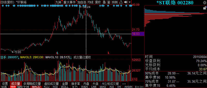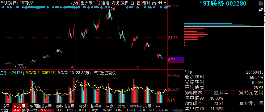 (3)股價在經(jīng)過一段時間的震蕩之后,如果出現(xiàn)向下的趨勢,那么說明主力快要出貨完畢了。而在觀察這個時候的籌碼分布圖就會發(fā)現(xiàn),股價在結(jié)束盤整啟動下跌的時候,頂部的籌碼峰已經(jīng)成型而底部的籌碼峰也已經(jīng)轉(zhuǎn)移到了頂部。
