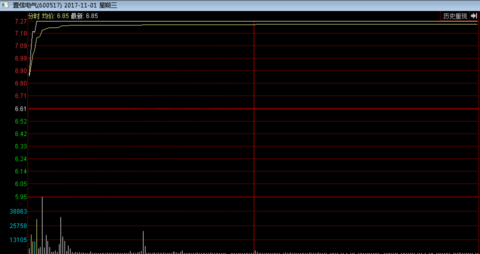 在置信電氣中,前期個(gè)股在較低的位置進(jìn)行震蕩洗盤(pán),中間也出現(xiàn)過(guò)莊家試盤(pán),并在洗盤(pán)之后出現(xiàn)一個(gè)無(wú)量下跌確認(rèn)籌碼鎖定,然后突然出現(xiàn)放量一個(gè)快速的拉升。我們看2017年11月1號(hào)的當(dāng)日分時(shí)就能發(fā)現(xiàn),早盤(pán)快速放量拉升,從漲速榜中選出來(lái)之后,結(jié)合成交量就該果斷的買(mǎi)進(jìn)。