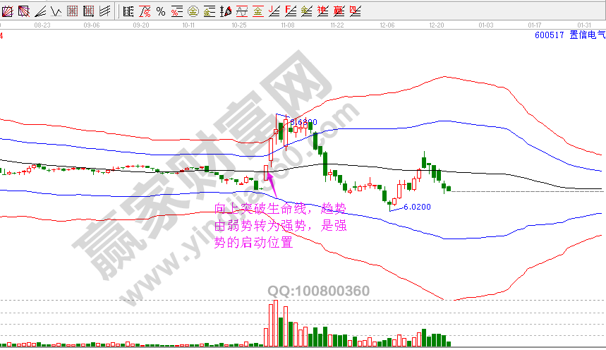 既然是贏家江恩的短線異動(dòng)選股方法,那一定是要用贏家江恩的市場(chǎng)分析方法給與最后的判斷以及操作計(jì)劃制定。在贏家江恩的操作規(guī)則中,極反通道生命線將個(gè)股分為強(qiáng)勢(shì)和弱勢(shì)兩個(gè)區(qū)域,生命線上為強(qiáng)勢(shì),生命線下為弱勢(shì),一旦個(gè)股從下往上突破生命線,就可以看做是弱勢(shì)向強(qiáng)勢(shì)的趨勢(shì)轉(zhuǎn)變,是強(qiáng)勢(shì)啟動(dòng)的位置。我們還以置信電氣為案例,看看在2017年11月1號(hào)出現(xiàn)異動(dòng)時(shí),極反通道圖形是如何的。