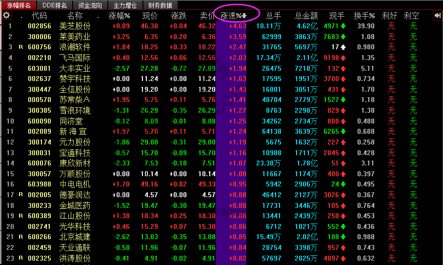盤(pán)中個(gè)股的表現(xiàn)都不同,3000多只個(gè)股我們?cè)趺磸闹姓页鰜?lái)適合的短線異動(dòng)個(gè)股?這里可以重點(diǎn)關(guān)注一個(gè)點(diǎn),即個(gè)股的漲速。通常情況下關(guān)注排在看盤(pán)軟件首頁(yè)的漲速大的個(gè)股。當(dāng)個(gè)股在短時(shí)間快速異動(dòng),必定是有突發(fā)的情況影響,比如盤(pán)中的突發(fā)消息,或是龍頭個(gè)股帶動(dòng)的板塊聯(lián)動(dòng),或是資金的介入等等,所以觀察個(gè)股的漲速,大海撈針,找到要做二步分析的標(biāo)的。