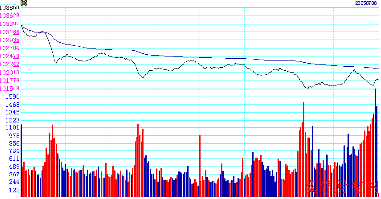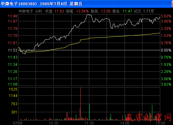技術分析:仍然以2005年7月8日當天上證指數分時走勢為背景,個股我們選取600360華微電子。華微電子屬于電子元件板塊,當天股價在開盤后隨指數的下跌出現小幅的向下震蕩,股價下跌幅度小于指數下跌幅度。后期,指數弱勢震蕩時,每一次小的反彈對應股價的是一個快速的上漲。指數出現殺跌時,對應的股價一般進行短時間的調整。股價能夠在盤中形成逆勢操作是因為盤中主動資金在積極運作,股價才可以在指數下跌的時候不斷上漲。逆勢走高,如果漲幅不是很大,每一次上漲創出新高都是投資者的買入機會。