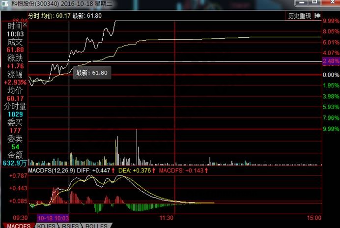 我們看一張科泰電源的分時走勢圖,該股在攻擊板上的時間是在上午10點03分,如下圖所示,我們在對比一下與之同一時間漲幅在兩個點左右的科恒股份。