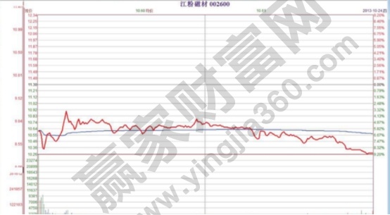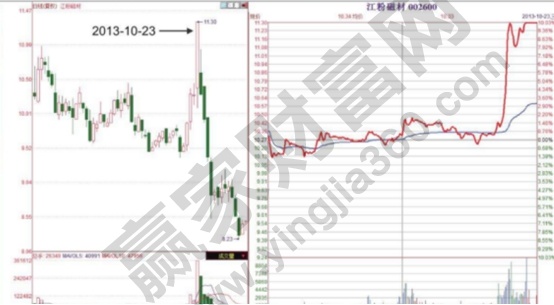 上面是江粉磁材在2013年10月份的日K線走勢圖,和在當年10月23日的分紅四走勢圖。在當天,這只股票因為預期重組的消息而漲停,但是由于這一消息很快得到了否認,所以在次日,上市公司發布公告:“江粉磁材:未來三個月內不會籌劃資產重組事項”,這使得個股大幅度低開,如下面的走勢圖形。