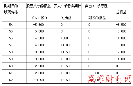 買入5手6月執(zhí)行價格為55美元的看漲期權,權利金為每股4美元;賣出10手6月執(zhí)行價格為60美元的看漲期權,權利金為每股2美元。