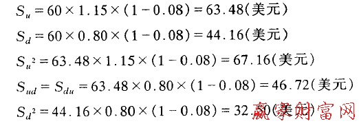 若股息不是常量,假設股票在時刻1支付$5,而u和d則代表股價扣除股息現值的升降幅度比率,則問題就容易解決了。可以S'表示股價減去股息現值的凈值,u和d就適用于s',但交易決策還是取決于S與E的比較。如果股票在時刻2除息,股息在零時刻的現值即為$5/1.10= $4.55,即若S' = $ 60,那么S=$60 + $ 4.55 = $ 64.55。