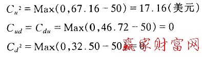 注意當股價為63.48美元時,買權的內在價值為Max (0, 63.48-50) = S 13.48,這高于公式價格13.37美元,此時應執行買權。把原Cu調整為13.48美元,再計算初始買權價格為:此時買權的內在價值為Max (0. 60一50) = $ 10,小于$10.50的公式定價,所以不宜提前行使,買權市場價應為$10.50。前面我們已知在不可提前行使的約束下,相同的歐式買權價格為$10.42。