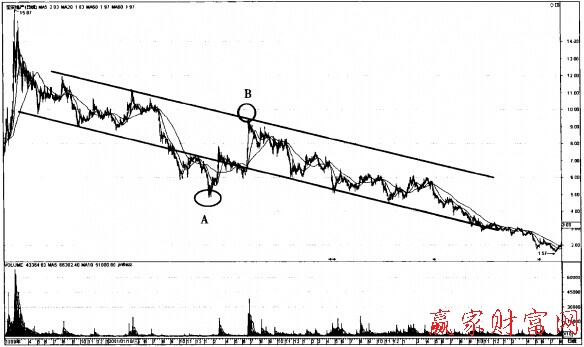 在熊市的中期階段,股指或個股大都已經形成了一個較為明顯的下降通道。這個下降通道的上軌往往對股價的反彈起到壓制作用,而通道的下軌則起到一定程度的支撐作用。交易者參與次級反彈行情可以把上軌作為反彈的目標位,一般來說除非是超大、超強的次級反彈行情會突破上軌,大多數次級反彈行情都會止步于此。