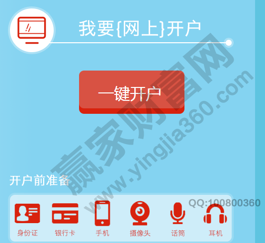 現場開戶:投資者到當地的證券營業部或證券登記機構,持本人身份證及復印件,委托他人代辦的,還需要提供代辦人的身份證及復印件,辦理上海、深圳證券賬戶卡(股東賬戶卡);填寫開戶資料與證券營業部簽署《證券委托交易協議書》,開設資金賬戶;如果開通網上交易,還需要填寫《網上開戶約定書》,簽署《風險揭示書》;到銀行卡所在的銀行,出示《交易結算資金銀行存管協議書》,辦理資金的第三方存管;下載合作證券公司的行情交易軟件。非現場開戶:如網上開戶,登陸想要合作的證券公司官網,后續一步一步完成相關步驟,相關的手續變成了電子版的,同樣需要填寫相關信息,上傳照片,多了一個視頻認證,需要本人錄制一段短視頻上傳。根據步驟也非常簡單。目前在各個證券公司的官網上都開通了網上開戶的按鈕,只要選定證券公司之后,使用電腦和手機開通就可以。如下圖某一證券公司開戶界面。