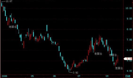 老鼠倉的k線形態一般有兩種:第一種是長下影線形態;另一種是大幅跳低開盤所形成的長影線。