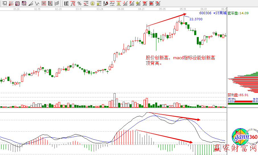 意思是:當K線圖上的股票走勢一峰比一峰高,股價一直在向上漲,而MACD指標圖形上的紅柱或黃白線構成的圖形走勢是一峰比一峰低,即當股價的高點比前一次的高點高、而MACD指標的高點比前一次高點低,這叫頂背離現象。