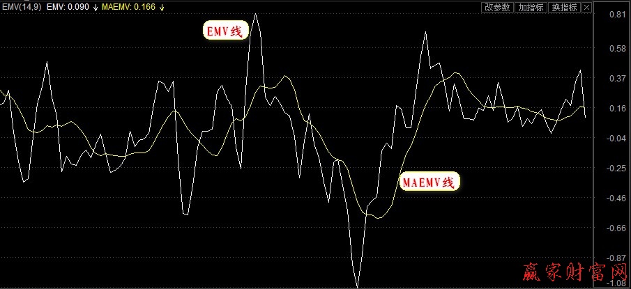 成交量和股價配合的原理制作而成。如果較少的成交量就能推動股價的上漲,則EMV值會升高;相反如果股價下跌時,僅伴隨有較少的成交量,則EMV的值會降低。另外,如果股價不漲不跌,或者股價上漲和下跌的時候都伴隨著大的成交量,則EMV的值將趨向于零。