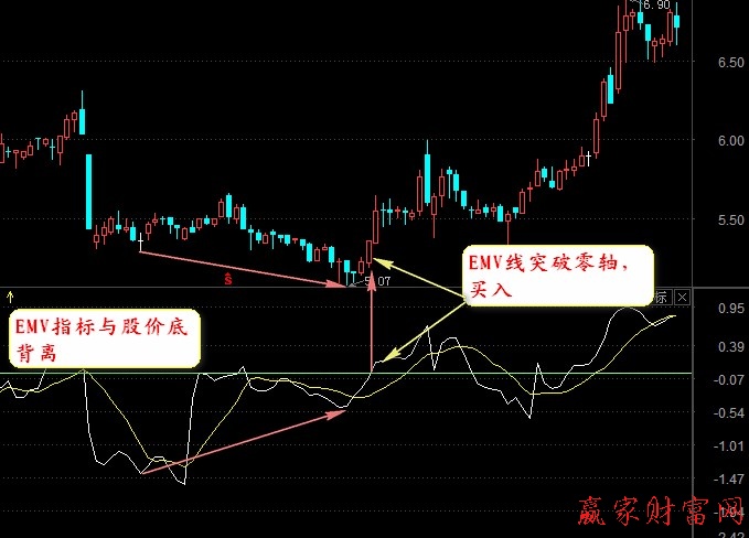 股價經過一段時間的下跌,并且屢創新低時,EMV指標并未出現同步,而是形成一底比一底高的走勢,此時指標與股價形成背離。背離的產生意味著隨著股價的下跌,成交量也在逐漸的放大。這是資金進場的標志,說明股價即將見底反彈。因此,投資者即可在EMV線向上突破零軸時,積極買入股票。
