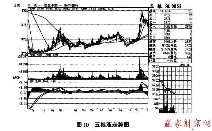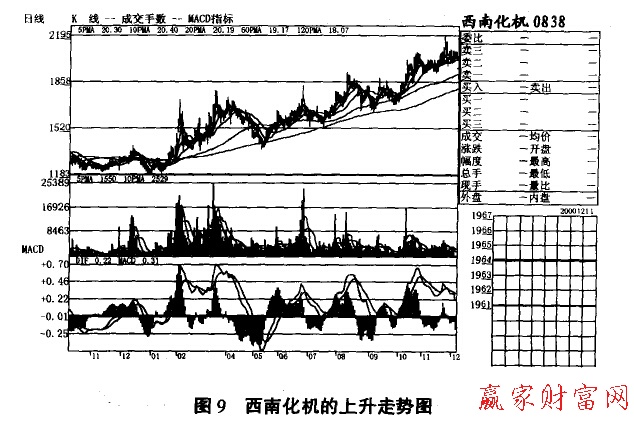 在股票市場上每逢大盤上漲時,總會聽到“強勢上漲,大膽介人”和“多頭向上,勇敢跟進”這兩句操作名言。所謂“多頭向上”,就是指各條移動平均線,在形成“黃金”交叉以后,經過一段時間的上漲走勢,形成了5日線,10日線,20日、30日均線等向上發散排列。如圖9、圖10所示。