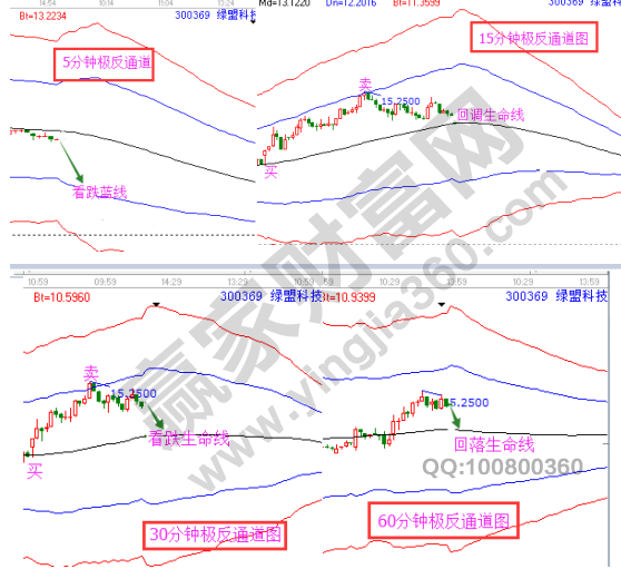 最后,將上述兩點結合,明天是漲還是跌就很清楚了。我們以個股300369綠盟科技為例,先看日線分析圖,該股當前剛好受制于極反通道藍線的壓力,1.382的時間收在藍線壓力下方,日線頂背離,且量能不濟,看跌生命線的趨勢。再看日內各周期:5分鐘生命線下弱勢看跌藍線的趨勢;15分鐘回調生命線趨勢;30分鐘藍線受阻看跌生命線的走勢;60分鐘同樣回落生命線的趨勢,則,不管是日線級別還是日內級別,該股都是明顯的下跌趨勢,那明日大概率就是跌。學會了嗎?找到你的股票,同樣的方法復制去做,就可以得到答案!