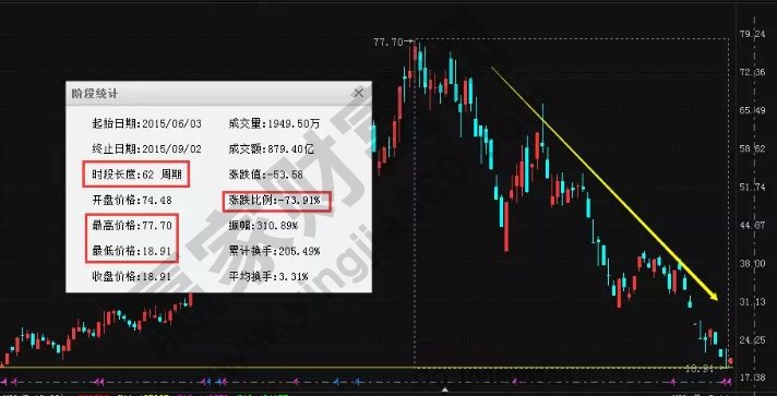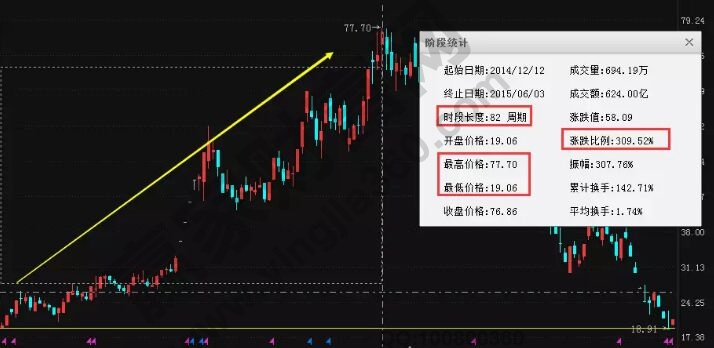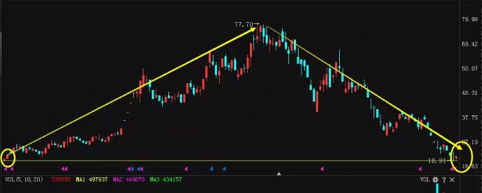 這只股拍哦其實是走了一個輪回,從18元上漲到了77元,也從77元跌回到了18元,所用的時間上基本上相同。那究竟從18元上漲到77元的漲幅是多少?從77元跌回18元的幅度又是多少?我們再來看一張圖形。