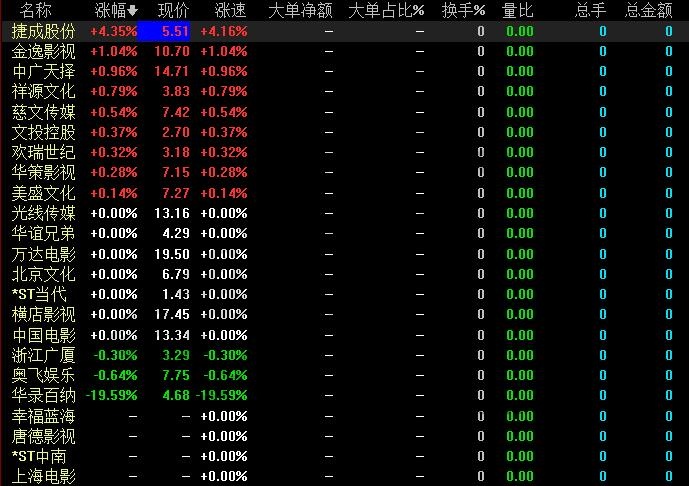 金逸影視一度觸及漲停,收盤漲幅4.45%;上海電影也是一度漲超8%,收盤漲幅5.42%;除此之外,唐德影視漲停;*st當代漲停;影視行業龍頭華誼兄弟也上漲了3.07%;中國電影享有進口影片引進權,上漲了2.29%;而萬達電影作為我國最大的院線公司上漲了2.13%。