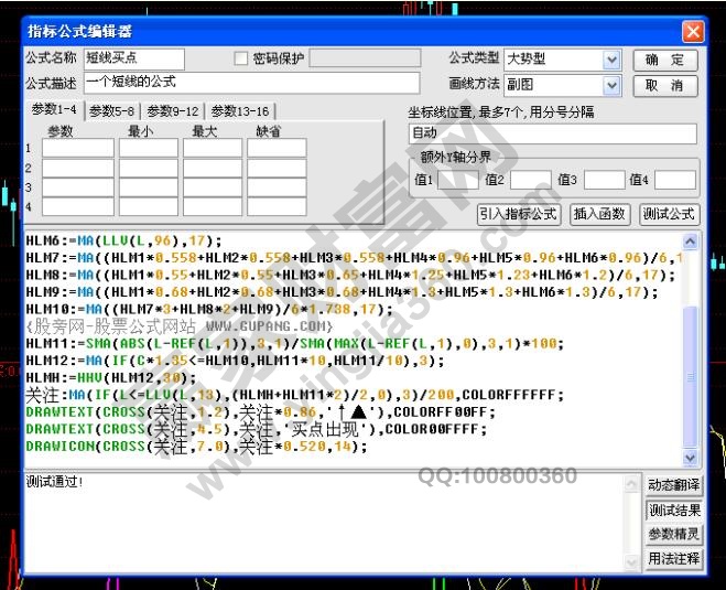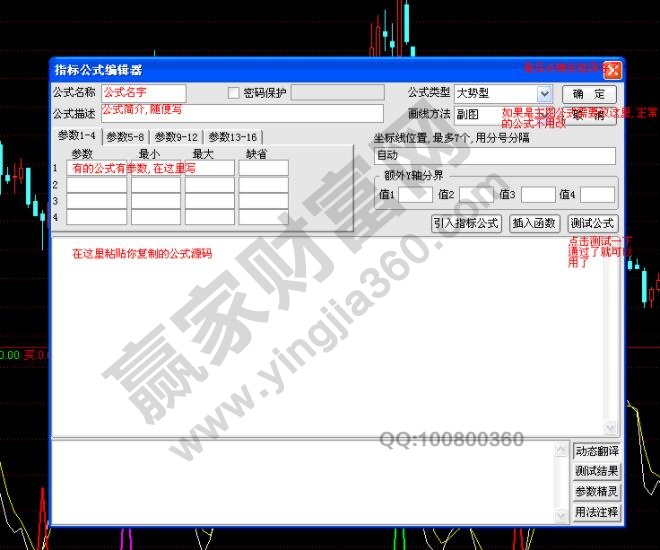 (2)按照紅色文字提示進行操作,有一些公式是帶參數的,比如說(N 1 100 10):參數是N,最小1,最大100,缺省10;源碼是主圖公式的話要像幾日均線一樣在k線上疊加顯示,需要我們吧畫線方法換成主圖模式;點擊測試公式;點擊確定進行保存。
