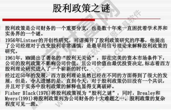 股利政策是指在法律允許的范圍內,對是否、多少、何時支付股利的政策和對策。股利政策的最終目標是公司價值最大化。