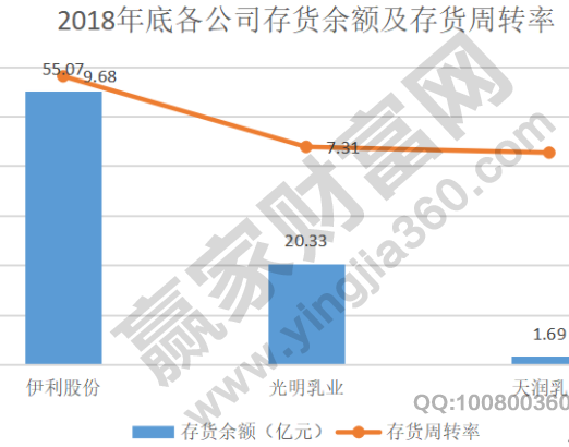 光明乳業、伊利、天潤,三家對比存貨余額,分別是20.33億元、55.07億元、1.69億元。伊利相對來說最高,看余額是沒有辦法比較的。那么對比存貨周轉率,伊利為9.68次,光明以及天潤分別是7.31次、7.11次,伊利還是比較高。也就是說,同等規模10億的存貨,伊利的銷售會更好,可以賣出96.8億,而光明可以賣出73.1億,天潤可以賣出71.1億,自然而然,伊利的營收會更高。