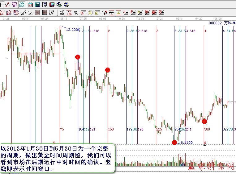 最后是時間。時間是決定是長走勢的最重要因素,因此對時間的判斷是三步分析法中,也是我們分析股票中非常重要的一個環節,我們經常會遇到這種情況,買入股票之后,股價一直在盤整,沒有上攻或這下跌的動力。此時就說明我們買入股票的時間是不對的。因此對時間的判斷既可以讓我們更加容易的把握市場走勢,同時也可以幫我們節省不必要的持股時間。對此,我們通過黃金時間周期線來看(時間工具有很多,需要根據不同的形態使用不同的工具來分析)。如下圖,我們通過時間工具可以看出,在該股的后市運行中的重要時間變盤點都在豎線上。因此我們認為該工具判斷是有效的。從圖上看,目前該股的時間窗口就是接下來的6月30日,以及7月10日。在這兩天,我們應多注意該股所處位置是在價格的支撐還是阻力,并由此來判斷,該股趨勢轉折方向。
