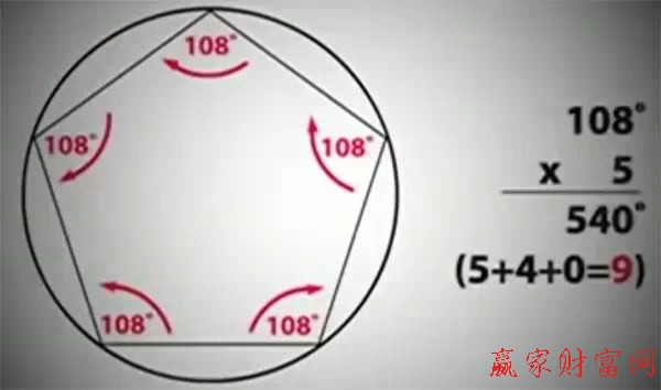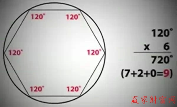 那么0-9的數(shù)字是不是有什么神奇秘密呢?下面看正五邊形和六邊形的角度之和。