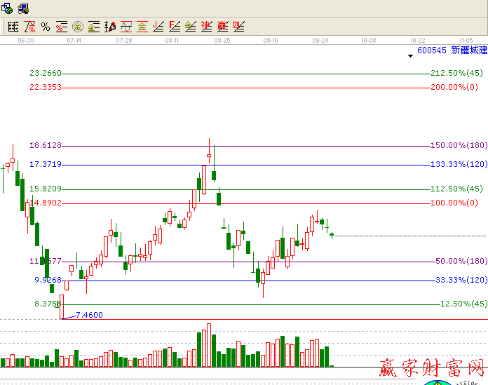 上面是在價格上有一個圓形的概念,其實在做周期分析的時候也是有圓的360度在里邊的。我們將一個圓形的360度看做市場的時間周期的單位,然后用二分之一、四分之一和八分之一等比率進行分割,得到180度、90度、45度,這樣分割出來的位置往往是重要的市場轉折點。就像下面的K線圖形中,我們標注出了600545從低點7.46開始的7個高點及低點,對應時間1——7月14日,2——7月16日,3——7月23日,4——7月28日,5——8月20日,6——9月8日,7——9月23日。我們用