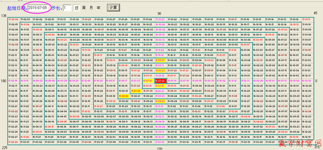 江恩的時間四方形,將低點7.46的時間7月9日進行360的分割,得到下圖2,可以發現在四分之一90度上,出現了兩個時間轉折點,在二分之一180度線上出現一個時間轉折點,在八分之五225線上出現兩個時間轉折點,在八分之六270度線上出現兩個時間轉折點,這就是圓形在時間上的運用。