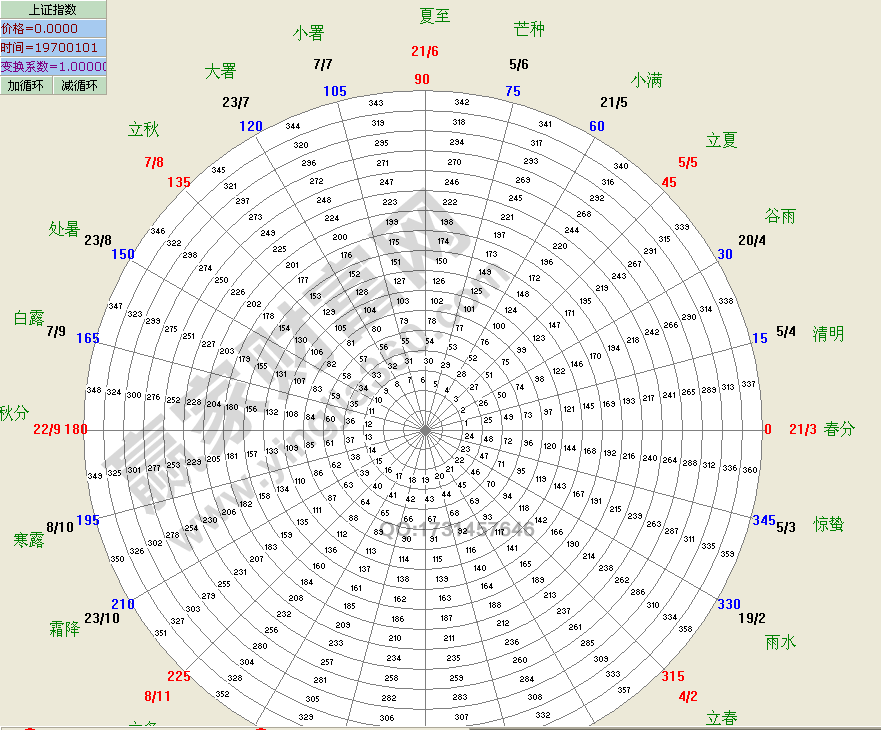 這個是江恩的研究者根據時空變化的聯動關系繪制出的時空變化統一圖,以周天圓圖360°表示時間周期概念,以百分比分法(100%)表示空間量化概念,也是金融市場中漲跌百分比規律。用這樣的方法公度年和百分比就結合成一體,金融市場的運行周期與漲跌幅度總是統一于周天公度圓之中,而每一種品種都有其獨特的波動率,如果我們能掌握這種波動率,就能明確地知道這種產品會在什么價位出現強大的支撐位或阻力位。