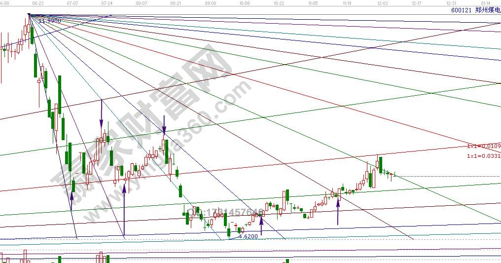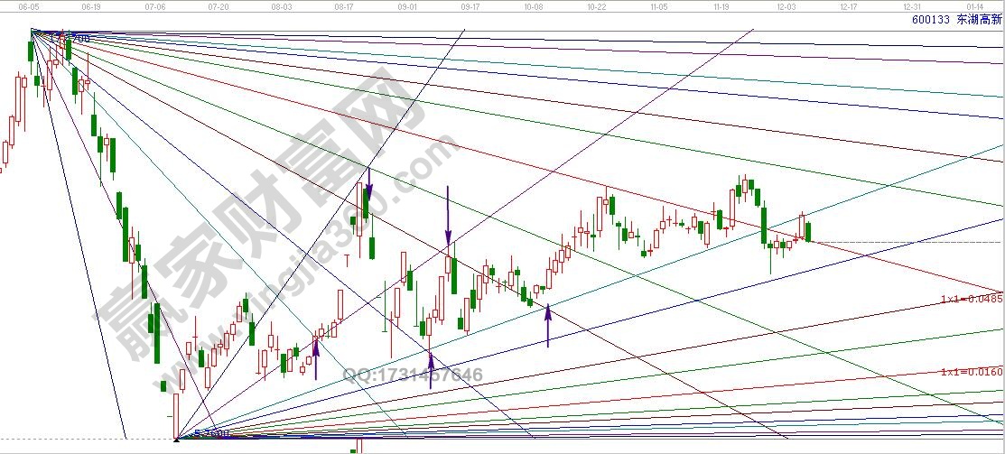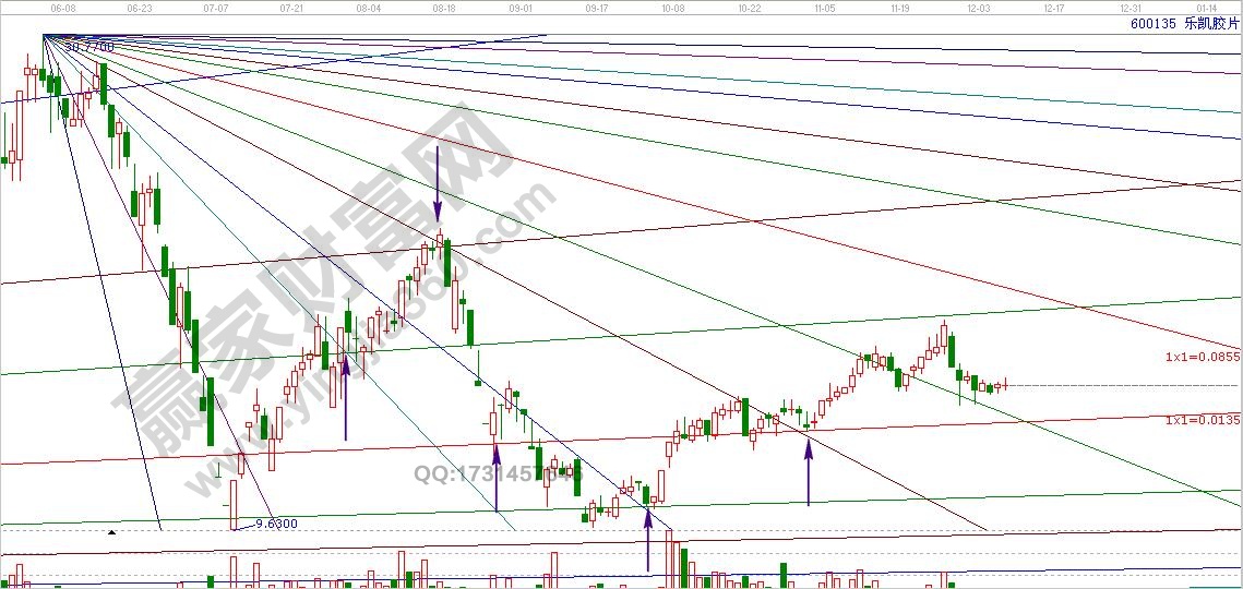 上面講的再多,也還是要實戰(zhàn)來驗證,我們下面就用幾只個股使用角度線來分析一下,展示交點對位的用法。