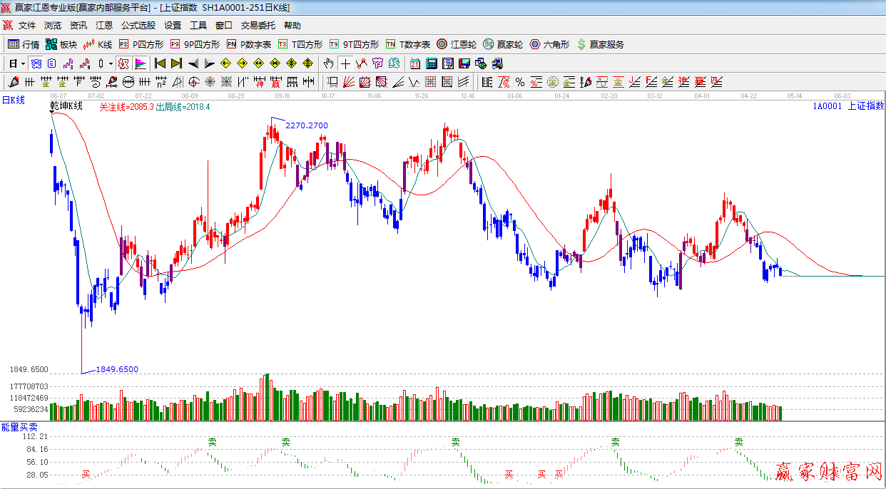 ☆依據贏家江恩系統乾坤K線提示:處于藍色休息區域,出局線下方,看空。