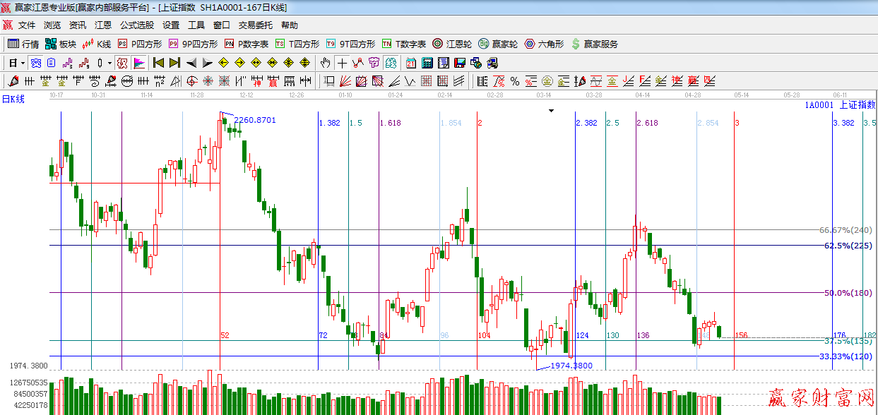 江恩看盤綜述:依據贏家江恩技術工具分析得出:指數再次跌回江恩135度支撐附近,量能依然低迷,短 線市場將弱勢整理為主,近期時間窗12號附近,會給出方向選擇。操作上,倉位控制在3成。星級風險提 示:謹慎看空。