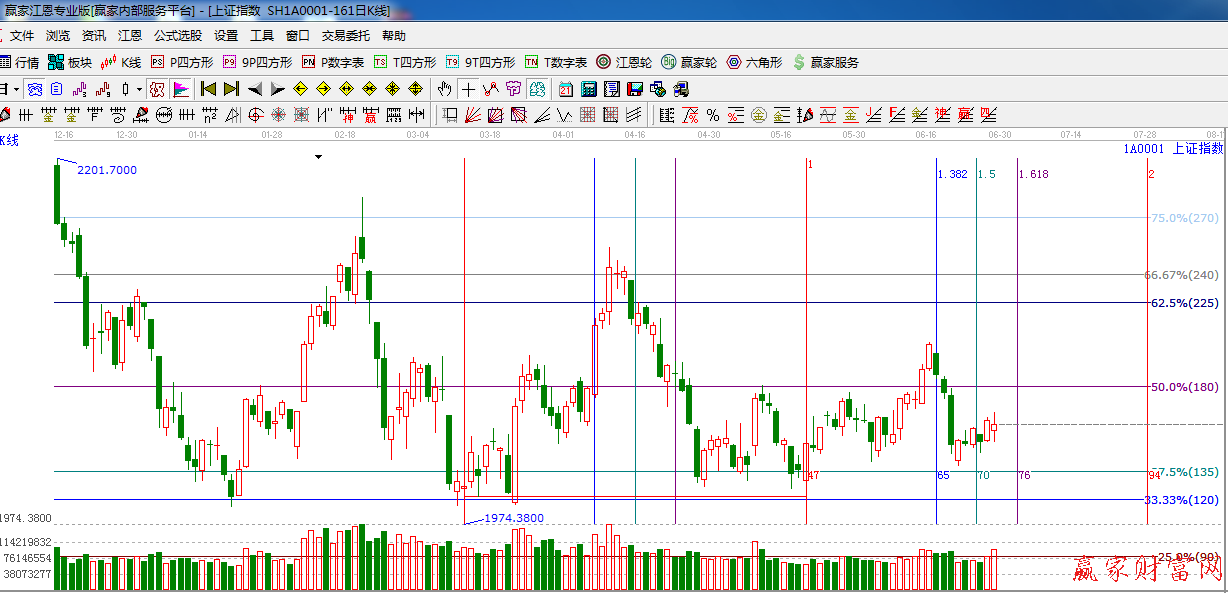 江恩看盤綜述:依據(jù)贏家江恩技術(shù)工具分析得出:周五生命線遇阻回落,收陰十字星,量能有所放大,生命線2040不能突破短期依然震蕩整 理或小幅下探,本周時間窗口7月2日附近,有望給出短期方向,操作上,倉位控制在3-5成。