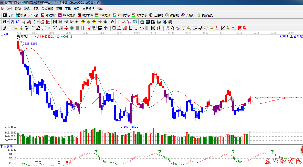★依據贏家江恩系統乾坤K線提示:k線處于關注線之上,k線由紫色轉變為紅色,以為指數進入多頭可操作區域,看多。