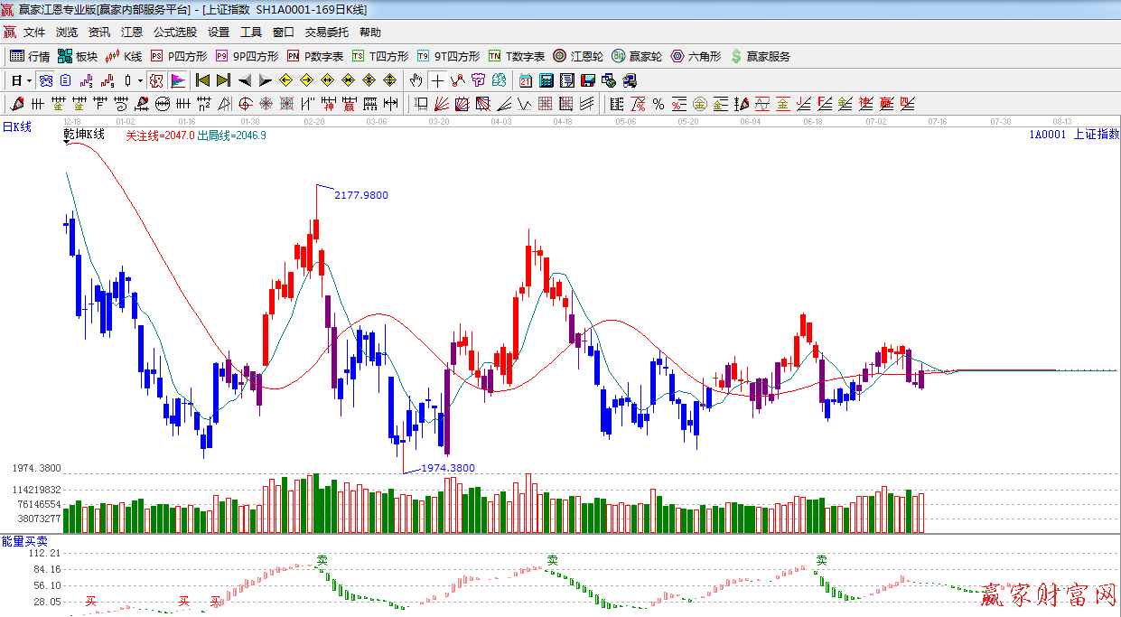 ☆依據贏家江恩系統乾坤K線提示: 紫色k線,紅色關注線之上,出局線之下,整體趨勢弱;